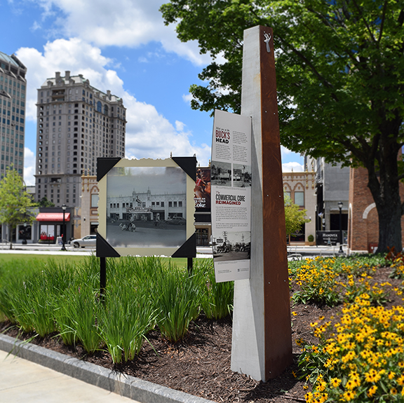 Sometimes you only have so much space to fit a lot of information! I designed this panel artwork for the lobby, dimensional type for “The Hive” gathering area, and exterior signage for the entrance.